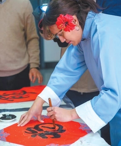 安雅在學(xué)校為留學(xué)生舉辦的新春活動(dòng)上用毛筆書(shū)寫(xiě)“?!弊?。受訪(fǎng)者供圖