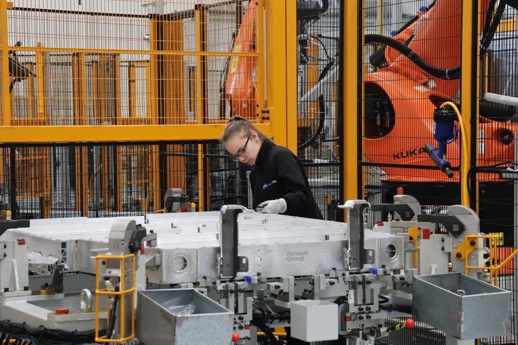 ?2月23日,在法國(guó)呂茨,中國(guó)敏實(shí)集團(tuán)與法國(guó)雷諾集團(tuán)成立的合資公司的員工在電池盒產(chǎn)線(xiàn)上工作。新華社記者張百慧攝