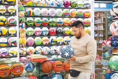浙江省義烏國(guó)際商貿(mào)城,來(lái)自厄瓜多爾的外商在選購(gòu)球類。時(shí)寬兵攝(人民視覺)