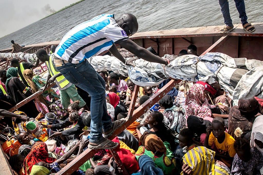 當(dāng)?shù)貢r(shí)間2024年3月21日,人們坐上船只抵達(dá)南蘇丹,逃離沖突。