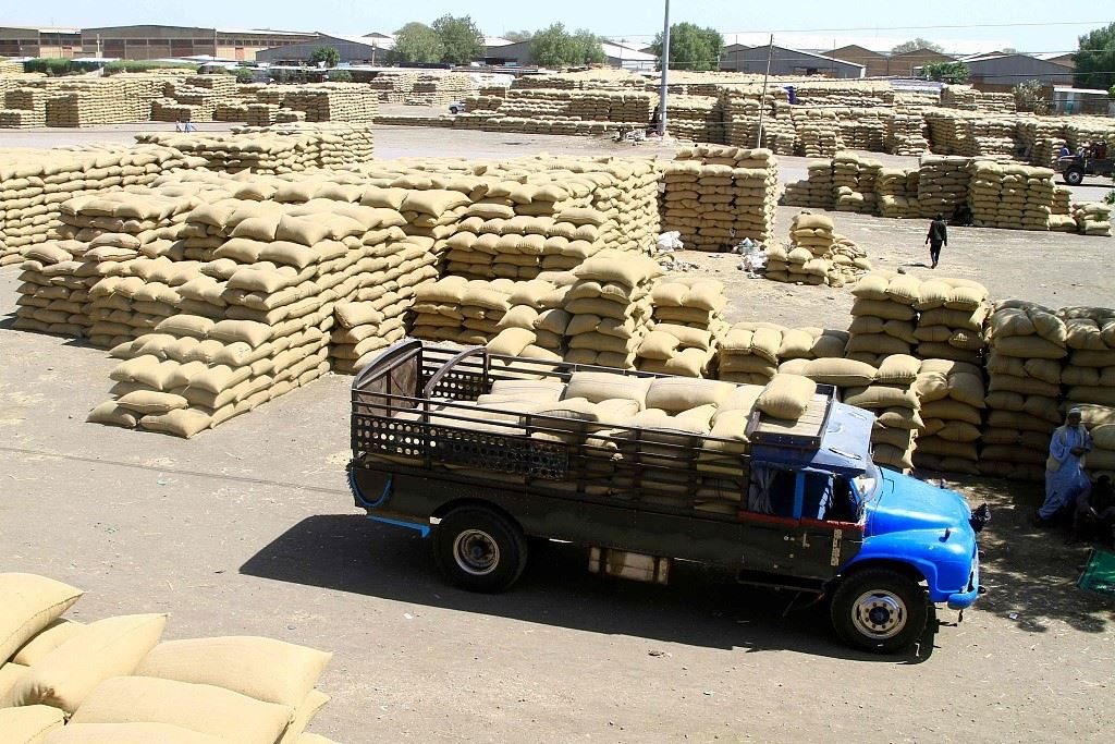 當(dāng)?shù)貢r(shí)間2024年2月22日,蘇丹東部杰達(dá)雷夫市,卡車在一個(gè)市場(chǎng)里運(yùn)送谷物。聯(lián)合國(guó)糧食計(jì)劃署表示,蘇丹長(zhǎng)期武裝沖突導(dǎo)致當(dāng)?shù)亟^大多數(shù)人都面臨饑餓。