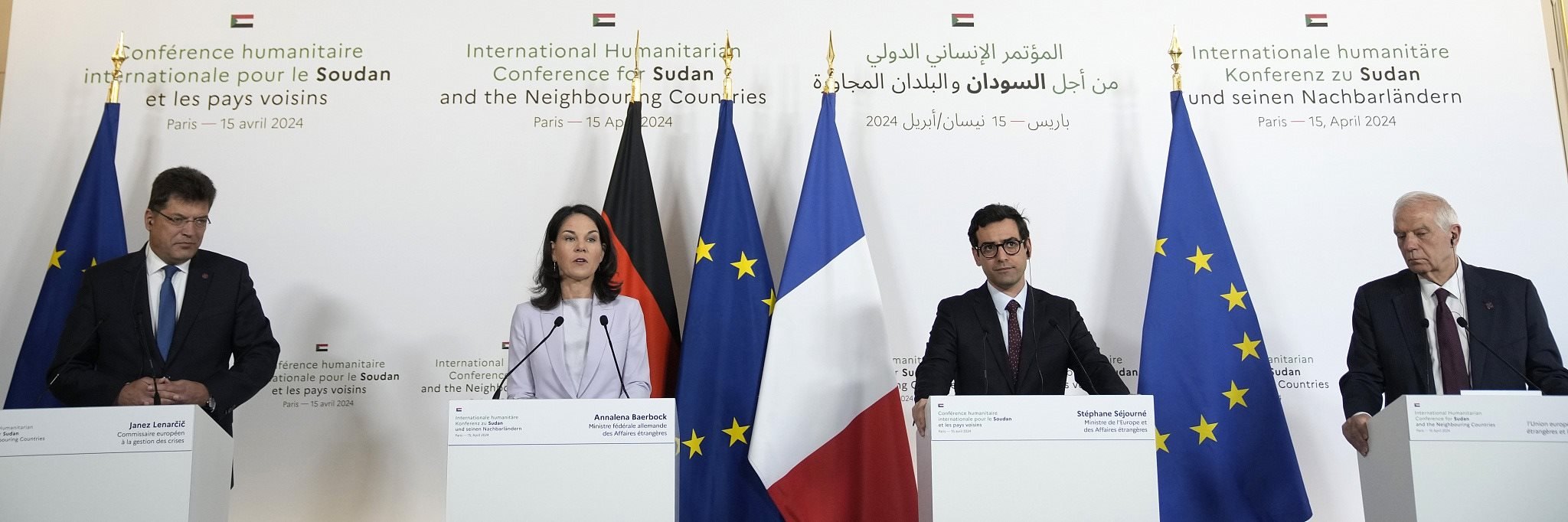 當(dāng)?shù)貢r(shí)間2024年4月15日,法國(guó)巴黎,法國(guó)外交部長(zhǎng)斯特凡納·塞茹爾內(nèi)(右二),德國(guó)外交部長(zhǎng)安娜萊娜·貝爾伯克,歐盟危機(jī)管理專員約翰·萊納西奇(左)和歐盟外交與安全事務(wù)高級(jí)代表何塞普·博雷利參加了蘇丹及其鄰國(guó)國(guó)際人道主義會(huì)議的聯(lián)合新聞發(fā)布會(huì)。