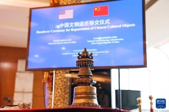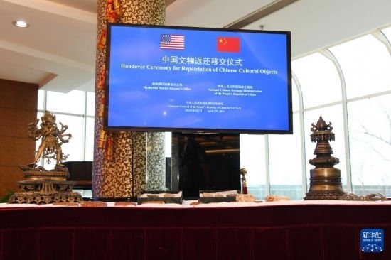 4月17日,在美國紐約中國駐紐約總領(lǐng)館,中美雙方代表出席中國流失文物藝術(shù)品返還移交儀式。新華社記者 李睿 攝