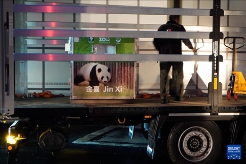 4月29日,在西班牙馬德里,工作人員轉(zhuǎn)運(yùn)大熊貓“金喜”。新華社發(fā)(西班牙馬德里動物園供圖)