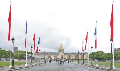 法國(guó)巴黎榮軍院前街道兩側(cè)懸掛中法兩國(guó)國(guó)旗。本報(bào)記者 王 遠(yuǎn)攝