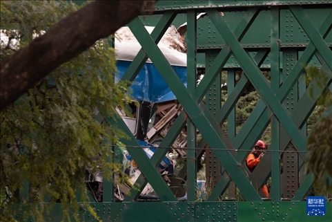5月10日,救援人員在阿根廷首都布宜諾斯艾利斯火車相撞事故現(xiàn)場工作(無人機照片)。新華社發(fā)(馬丁·薩巴拉攝)