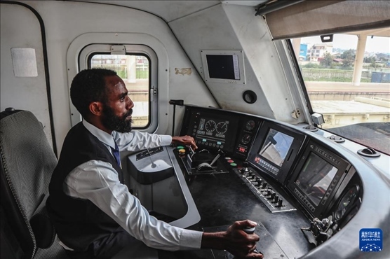 ?2024年5月10日,埃塞俄比亞火車司機(jī)在亞吉鐵路列車的駕駛室里工作。新華社記者 劉方強 攝