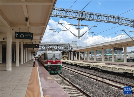 ?2024年5月10日,一輛列車駛?cè)氚H肀葋喪锥紒喌乃箒嗀惏偷睦蓟疖囌?。新華社記者 劉方強 攝