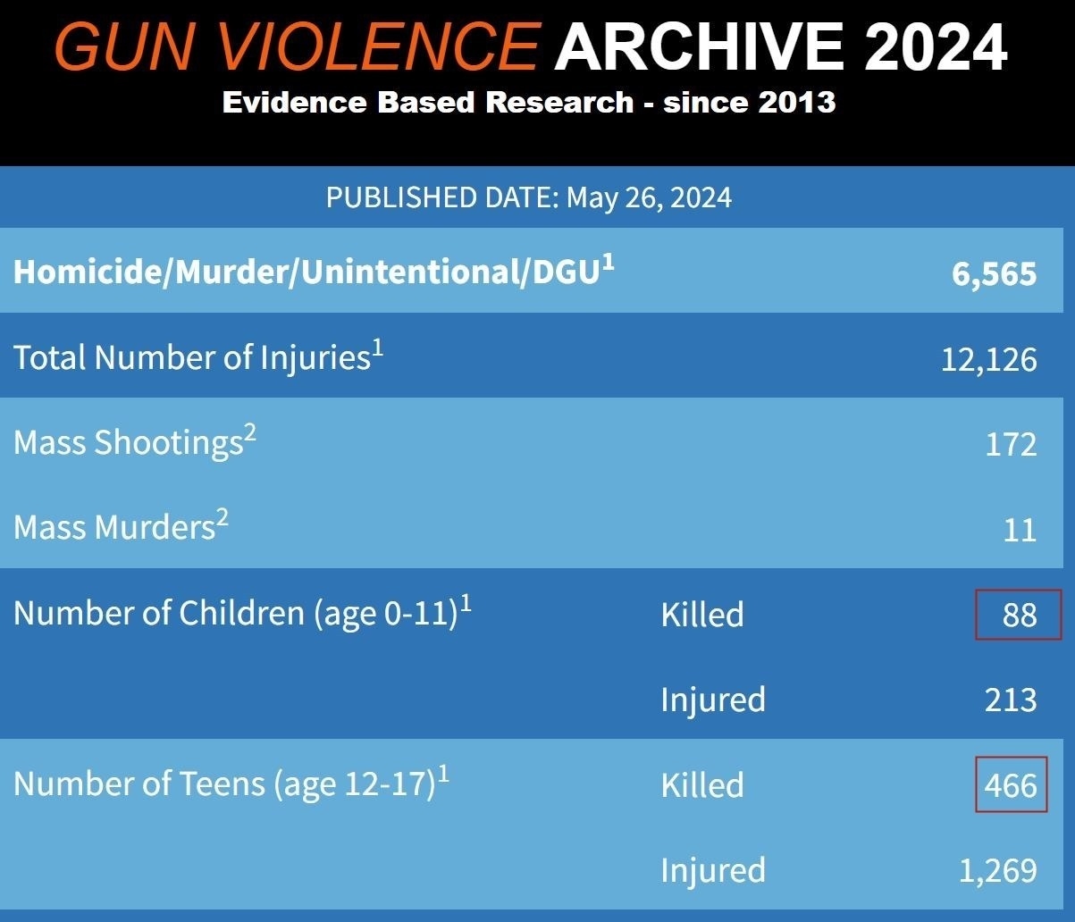 而根據(jù)美國“槍支暴力檔案”網(wǎng)站的數(shù)據(jù),截至5月26日,今年以來全美已有554名兒童和青少年因槍擊身亡。