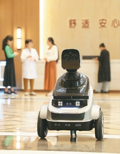 圖為在山東省東營市東營區(qū)德康寧醫(yī)養(yǎng)中心,智能機(jī)器人在巡檢。劉智峰攝(人民視覺)