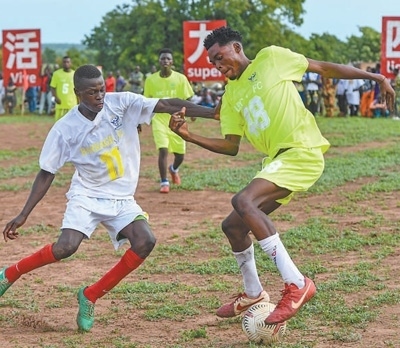 貝寧村民足球賽中,雙方球員正在足球場上拼搶。本報(bào)記者 黃培昭攝