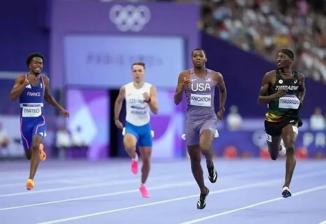 2024年8月5日,美國(guó)選手奈頓(右二)在比賽中。當(dāng)日,巴黎奧運(yùn)會(huì)田徑男子200米第一輪比賽在法蘭西體育場(chǎng)舉行。新華社記者呂小煒 攝