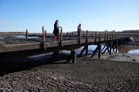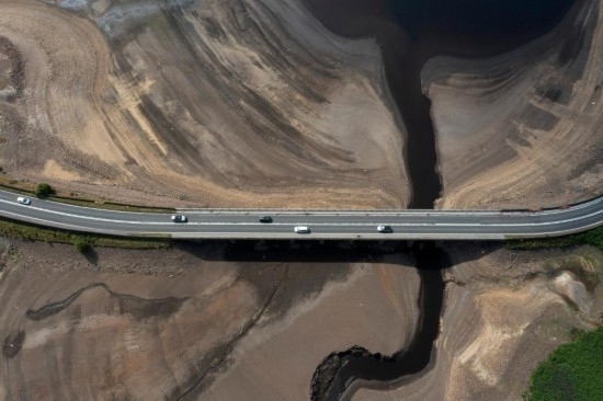 這是2022年7月19日在英國(guó)曼徹斯特附近拍攝的幾近干涸的伍德黑德水庫(kù)(無(wú)人機(jī)拍攝)。新華社發(fā)(喬恩·休珀攝)