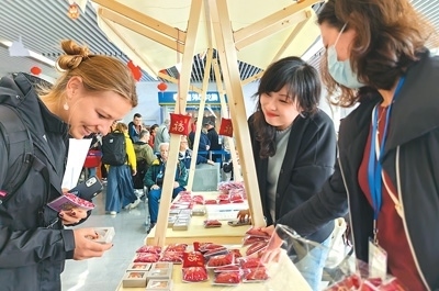 入境游客在上海吳淞口國際郵輪港到達大廳設(shè)立的攤位前駐足,了解文創(chuàng)產(chǎn)品。新華社記者 陳愛平攝