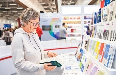 10月17日,參觀者在德國(guó)法蘭克福書(shū)展中國(guó)聯(lián)合展臺(tái)翻閱圖書(shū)。 新華社記者 張 帆攝