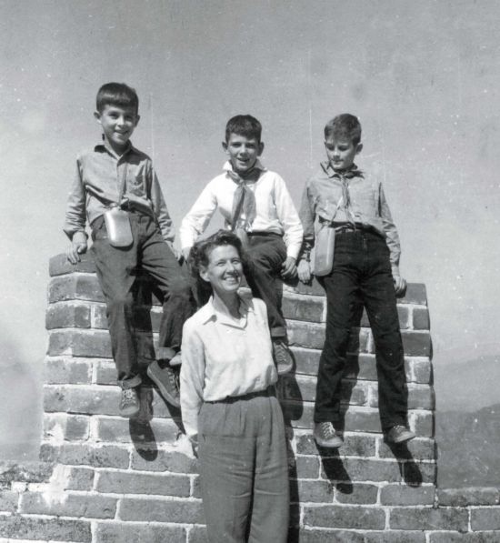 20世紀(jì)60年代,伊莎白(前)帶孩子們爬長城。后排中為柯馬凱。