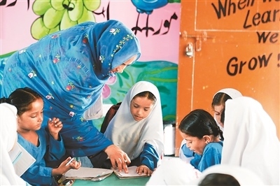走進(jìn)干凈整潔的校園,讀書(shū)聲、嬉戲聲聲聲入耳,孩童的活力、青春氣息撲面而來(lái)。在八年級(jí)的課室里,戴著一條寫(xiě)有“文學(xué)比賽冠軍”紅綬帶的女學(xué)生薩伊巴·阿斯加爾·阿里成功搶到了回答問(wèn)題的機(jī)會(huì),正在大聲地在全班面前朗誦英語(yǔ)課文。薩伊巴告訴記者,她有7個(gè)姐妹,如果沒(méi)有這所學(xué)校,她可能就沒(méi)學(xué)上了。