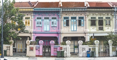 初至新加坡,我用腳步丈量這個國家,每一步都仿佛踩在歷史與現(xiàn)實的交匯點上。行至加東街區(qū)的如切路,仿佛走進時光的萬花筒,瞬間被頗具歷史感的娘惹建筑環(huán)繞。街道兩旁,色彩斑斕的娘惹排屋(見圖,約翰·西頓·卡拉漢攝,影像中國)如同一幅幅鋪開的絢麗油畫:中式飛檐與歐式廊柱巧妙融為一體;門窗上的雕花精致細膩,盡顯龍鳳等中國圖案的吉祥寓意、棕櫚紋等馬來元素的自然之美和歐洲巴洛克風格的華麗細節(jié);彩色玻璃在陽光下折射出五彩斑斕的光澤;繁復的花卉瓷磚如華麗織錦,讓人目不暇接……一步一景,皆散發(fā)著濃郁的南洋風情,好似輕吟淺唱一曲悠遠的歲月之歌。