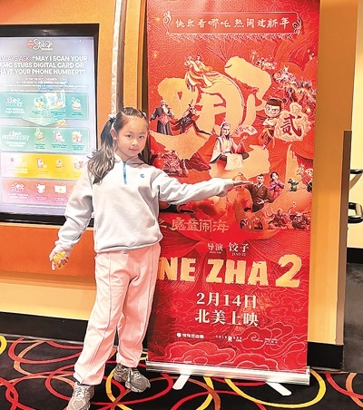 圖為唐夢竹的女兒在美國洛杉磯一家影院的《哪吒之魔童鬧?!沸麄骱笄傲粲啊?/p>