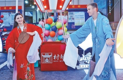 馬克西姆(右)和葉卡捷琳娜在“村越”現(xiàn)場體驗(yàn)越劇服裝。