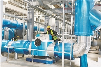 埃及新行政首都中央商務(wù)區(qū)項目能源中心設(shè)置的變頻空調(diào)水泵,為空調(diào)系統(tǒng)循環(huán)提供動力,通過變頻調(diào)節(jié)實現(xiàn)節(jié)省電能的目的。圖為工作人員對水泵進(jìn)行檢查和維護(hù)。