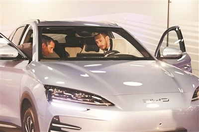 在匈牙利首都布達(dá)佩斯舉行的比亞迪某新款新能源汽車發(fā)布會上,嘉賓在了解車輛性能。