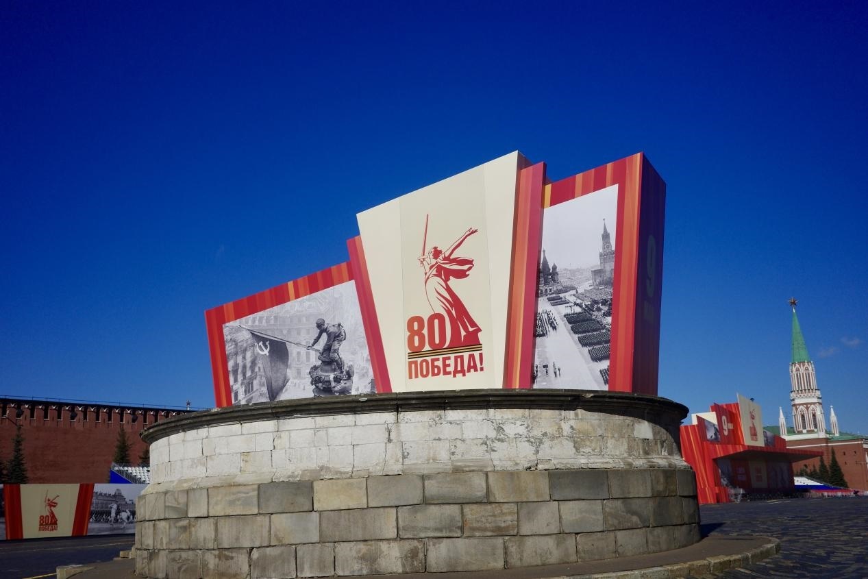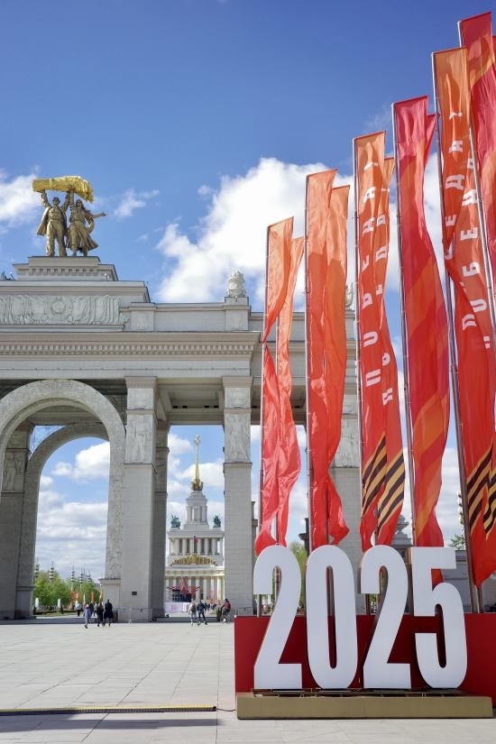 當(dāng)?shù)貢r間5月6日,莫斯科威登漢(國民經(jīng)濟(jì)成就展覽館)大門前一側(cè),布置好了2025標(biāo)志和紀(jì)念旗幟。劉少華 攝