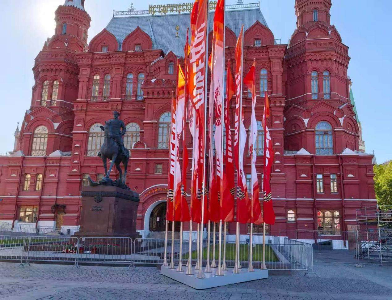 當(dāng)?shù)貢r間5月6日,俄羅斯國家歷史博物館前擺放紀(jì)念蘇聯(lián)偉大衛(wèi)國戰(zhàn)爭勝利80周年慶典旗幟。 鄺西曦 攝