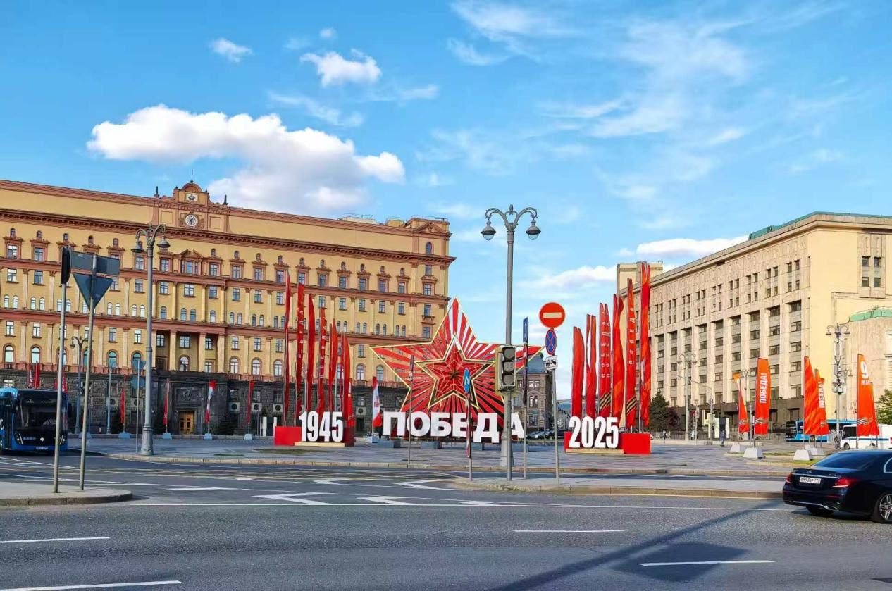 當(dāng)?shù)貢r間5月6日,莫斯科盧比揚(yáng)卡廣場布置紀(jì)念蘇聯(lián)偉大衛(wèi)國戰(zhàn)爭勝利80周年的標(biāo)語。鄺西曦 攝