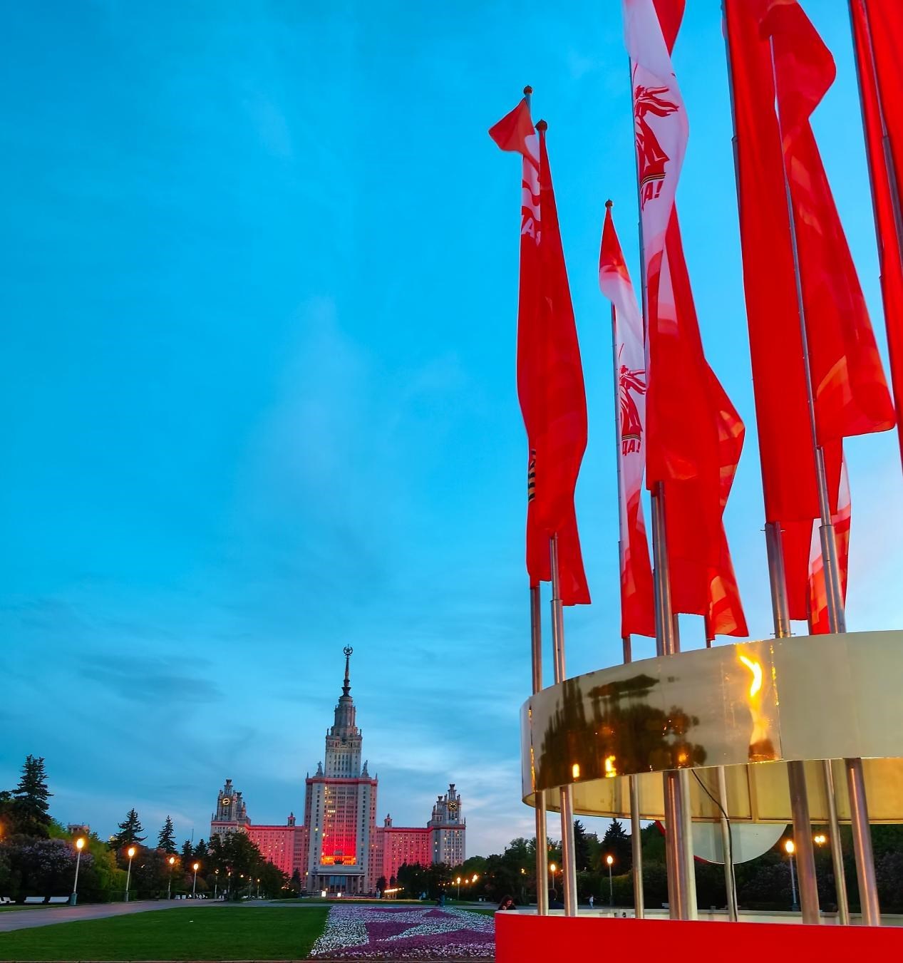 當(dāng)?shù)貢r間5月6日,莫斯科麻雀山,紀(jì)念蘇聯(lián)偉大衛(wèi)國戰(zhàn)爭勝利80周年慶典的旗幟飄揚(yáng),與莫斯科國立大學(xué)主樓的燈火遙相輝映。 鄺西曦 攝