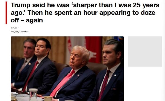 美國(guó)有線電視新聞網(wǎng)(CNN)注意到,當(dāng)美國(guó)商務(wù)部長(zhǎng)盧特尼克談及貿(mào)易戰(zhàn)時(shí),特朗普“似乎難以睜開(kāi)眼睛”。在美國(guó)教育部長(zhǎng)麥克馬洪和美國(guó)衛(wèi)生與公眾服務(wù)部長(zhǎng)小羅伯特·肯尼迪發(fā)言時(shí),特朗普“似乎僵住了,閉著眼睛,每次持續(xù)10到15秒,然后才轉(zhuǎn)動(dòng)眼球或點(diǎn)頭”。