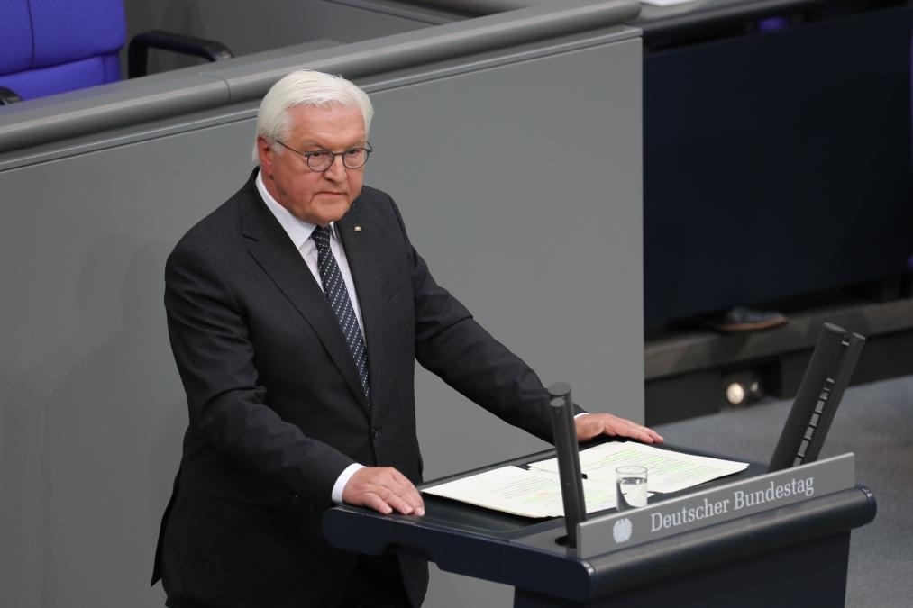 5月8日,德國總統(tǒng)施泰因邁爾在首都柏林國會大廈舉行的紀(jì)念活動(dòng)上致辭。新華社記者杜哲宇攝