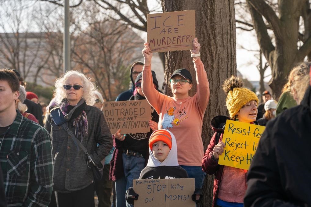 1月11日,在美國(guó)首都華盛頓,民眾抗議移民與海關(guān)執(zhí)法局暴力執(zhí)法。新華社發(fā)(李源清攝)