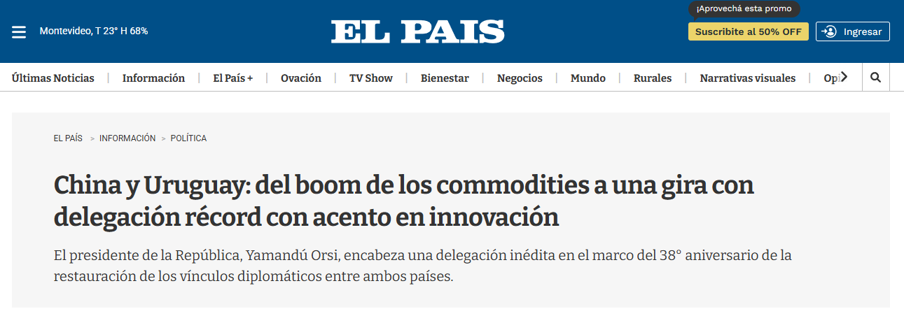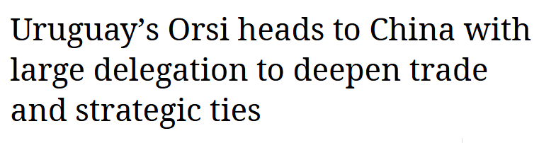 南美新聞機(jī)構(gòu)Merco Press報(bào)道稱(chēng),此次訪問(wèn)正值烏拉圭與中國(guó)建交38周年,烏拉圭總統(tǒng)奧爾西率領(lǐng)約150人的代表團(tuán)啟程訪華,旨在“加強(qiáng)與烏拉圭最大貿(mào)易伙伴之間的經(jīng)濟(jì)聯(lián)系”。