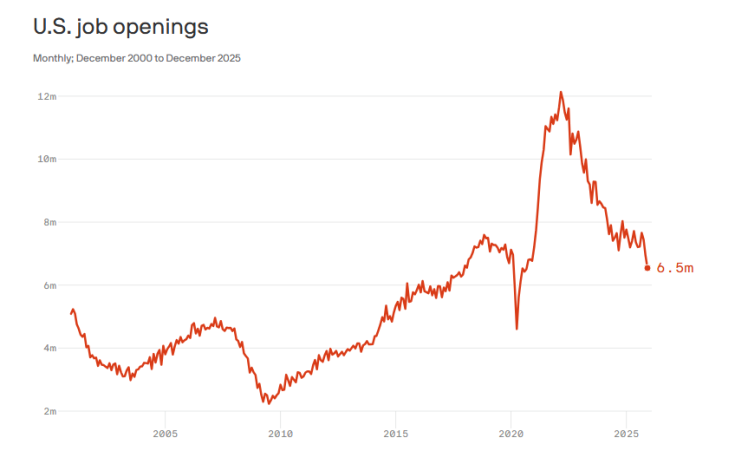 美國(guó)《國(guó)會(huì)山報(bào)》援引美國(guó)勞工統(tǒng)計(jì)局的數(shù)據(jù)報(bào)道稱,美國(guó)2025年12月份的職位空缺數(shù)量為650萬個(gè),呈下降趨勢(shì),較上年同期減少了96.6萬個(gè)。