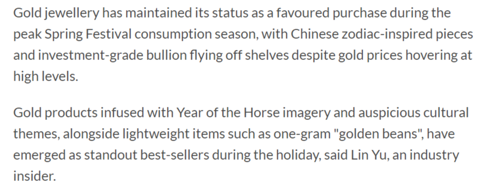 報(bào)道還稱(chēng),黃金珠寶在春節(jié)消費(fèi)旺季持續(xù)保持熱門(mén)購(gòu)買(mǎi)地位,盡管金價(jià)處于高位,但生肖主題設(shè)計(jì)的黃金飾品和投資級(jí)金條依然暢銷(xiāo)。報(bào)道援引業(yè)內(nèi)人士的話(huà)稱(chēng),融入馬年元素和吉祥文化主題的黃金產(chǎn)品,以及如一克“金豆”等質(zhì)量較輕的產(chǎn)品,在節(jié)日期間成為最暢銷(xiāo)的品類(lèi)。