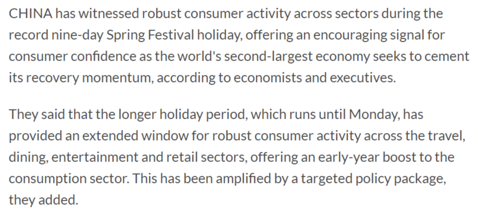 馬來(lái)西亞《星報(bào)》23日?qǐng)?bào)道稱(chēng),在創(chuàng)紀(jì)錄的9天春節(jié)假期期間,中國(guó)各領(lǐng)域消費(fèi)活動(dòng)強(qiáng)勁,這為世界第二大經(jīng)濟(jì)體鞏固復(fù)蘇勢(shì)頭傳遞了積極信號(hào),也彰顯了消費(fèi)者信心。