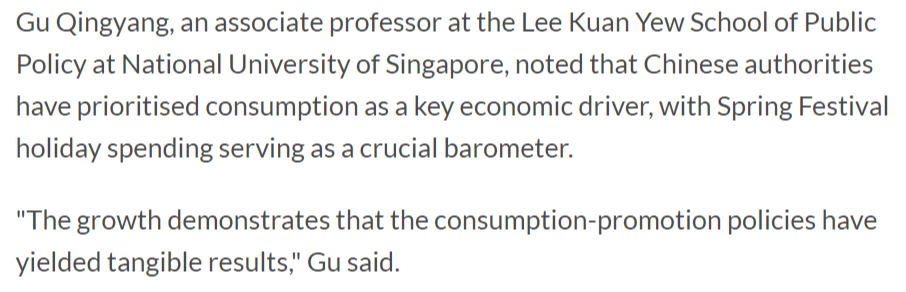 報(bào)道援引新加坡國(guó)立大學(xué)李光耀公共政策學(xué)院副教授顧清揚(yáng)的話(huà)表示,中國(guó)政府已將消費(fèi)列為關(guān)鍵的經(jīng)濟(jì)驅(qū)動(dòng)力,春節(jié)假期消費(fèi)則成為重要晴雨表?!霸鲩L(zhǎng)表明促消費(fèi)政策已取得切實(shí)成效?!?/p>