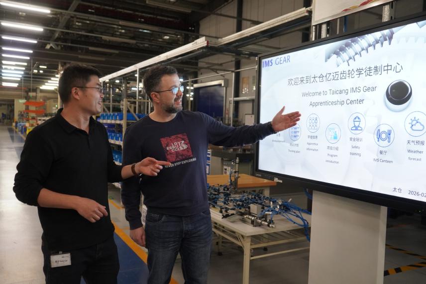 2026年2月24日,培訓(xùn)師托馬斯(右)在億邁齒輪(太倉)有限公司講解雙元制培訓(xùn)。(圖片來源:新華社)