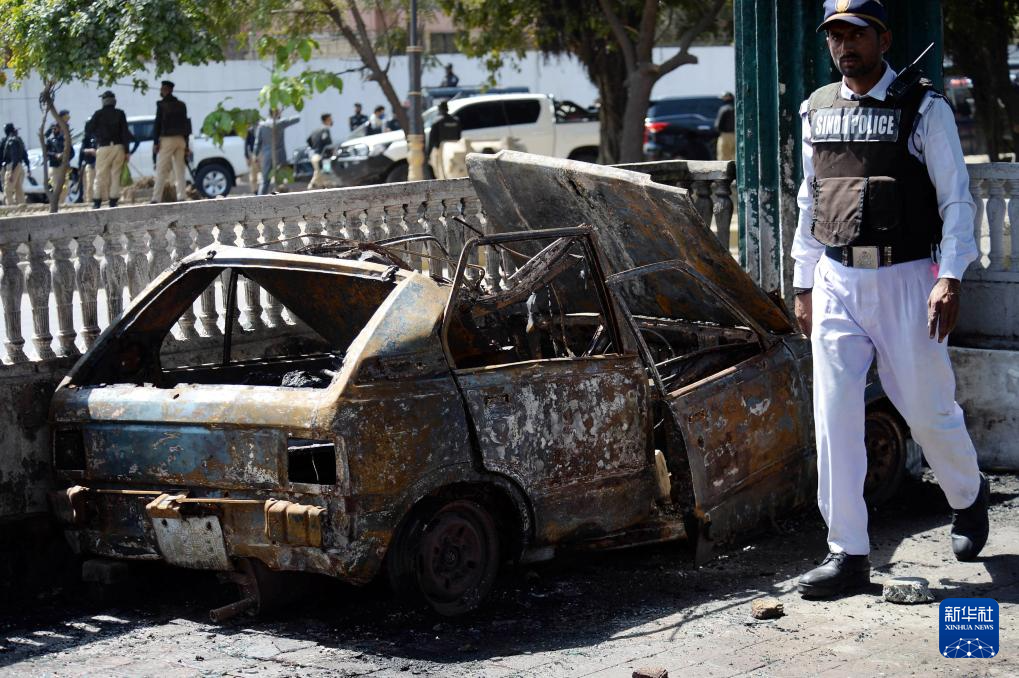 3月1日,在巴基斯坦南部城市卡拉奇的美國(guó)駐卡拉奇領(lǐng)事館附近,一名警察經(jīng)過被燒毀的車輛。