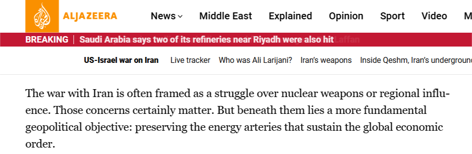 半島電視臺的報道稱,最近的事態(tài)發(fā)展表明,另一種更深層次、美國政府由來已久的“石油邏輯”正在發(fā)揮作用。美國的根本目的是控制資源,保障石油的流動性,這是全球資本主義經(jīng)濟的命脈。