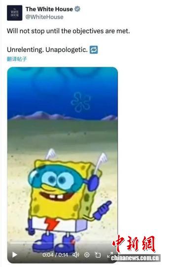 這是美國(guó)白宮社交媒體賬號(hào)截圖。該賬號(hào)發(fā)布的這段視頻中,海綿寶寶、電子游戲的歡快旋律與空襲伊朗的火光被剪輯在一起,視頻配發(fā)文字“不達(dá)目的不罷休”。