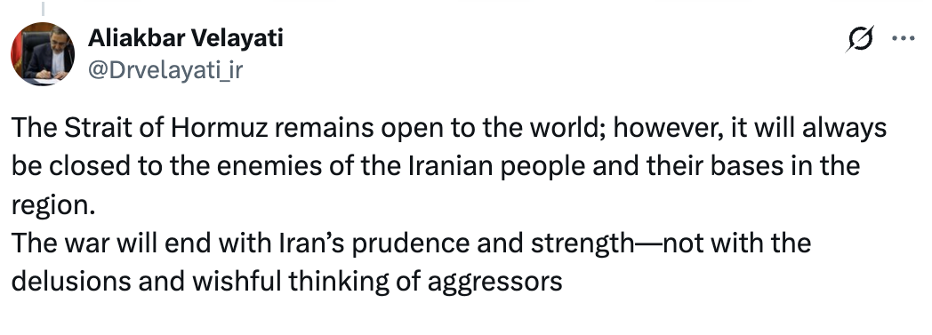 當(dāng)?shù)貢r間4月2日,伊朗最高領(lǐng)袖外事顧問、前外長韋拉亞提在其個人社交媒體平臺賬號上表示,霍爾木茲海峽對世界開放,但對伊朗人民的敵人及其在該地區(qū)的據(jù)點(diǎn)將永遠(yuǎn)關(guān)閉。