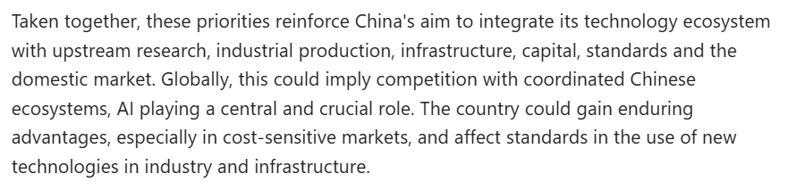 文章進(jìn)一步分析說(shuō),這些優(yōu)先事項(xiàng)強(qiáng)化了中國(guó)將其技術(shù)生態(tài)系統(tǒng)與上游研究、工業(yè)生產(chǎn)、基礎(chǔ)設(shè)施、資本、標(biāo)準(zhǔn)及國(guó)內(nèi)市場(chǎng)相融合的目標(biāo)。對(duì)全球而言,這意味著未來(lái)將面對(duì)一個(gè)高度協(xié)同的中國(guó)技術(shù)生態(tài)系統(tǒng),而人工智能將是這一系統(tǒng)的中樞。中國(guó)由此可能獲得持久的競(jìng)爭(zhēng)優(yōu)勢(shì),同時(shí)也會(huì)在工業(yè)及基礎(chǔ)設(shè)施的新技術(shù)應(yīng)用標(biāo)準(zhǔn)方面發(fā)揮越來(lái)越大的影響力。