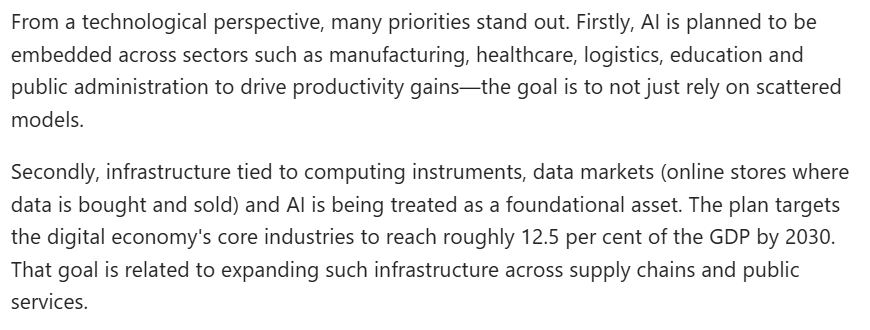 文章認(rèn)為,首先,人工智能被規(guī)劃融入制造業(yè)、醫(yī)療、物流、教育及公共管理等領(lǐng)域,以提升生產(chǎn)力,其目標(biāo)是不再局限于零散的應(yīng)用模式。其次,與計(jì)算設(shè)備、數(shù)據(jù)市場(chǎng)及人工智能相關(guān)的基礎(chǔ)設(shè)施,正被視作一種基礎(chǔ)性資產(chǎn)。規(guī)劃綱要提出,“十五五”時(shí)期數(shù)字經(jīng)濟(jì)核心產(chǎn)業(yè)增加值占國(guó)內(nèi)生產(chǎn)總值比重達(dá)到12.5%。這一目標(biāo)與在供應(yīng)鏈及公共服務(wù)領(lǐng)域擴(kuò)展此類(lèi)基礎(chǔ)設(shè)施密切相關(guān)。