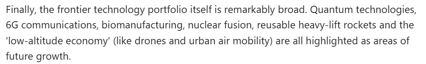 文章還注意到,當(dāng)前,中國(guó)繼續(xù)要求在科學(xué)技術(shù)等多個(gè)領(lǐng)域取得突破。這意味著,中國(guó)需要在整個(gè)技術(shù)體系層面構(gòu)建抗壓能力,而非依賴(lài)個(gè)別領(lǐng)域的孤立進(jìn)展。此外,規(guī)劃綱要所涵蓋的前沿技術(shù)領(lǐng)域極為廣泛。量子技術(shù)、第六代移動(dòng)通信技術(shù)、生物制造、核聚變、可復(fù)用重型運(yùn)載火箭以及“低空經(jīng)濟(jì)”(包括無(wú)人機(jī)與城市空中交通)等,均被明確為未來(lái)發(fā)展的重點(diǎn)方向。