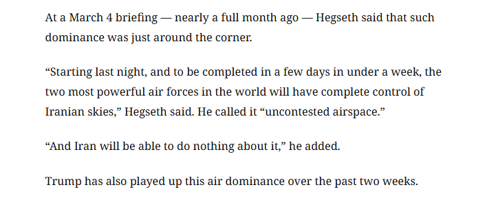 早在3月4日簡(jiǎn)報(bào)會(huì)上,赫格塞思就曾宣稱,“從昨晚起,并在未來(lái)數(shù)日內(nèi)、總計(jì)不到一周的時(shí)間,全球最強(qiáng)大的兩支空軍將實(shí)現(xiàn)對(duì)伊朗領(lǐng)空的全面控制?!?他將這一局面描述為“無(wú)對(duì)抗領(lǐng)空”,并稱“伊朗對(duì)此將毫無(wú)辦法”。過(guò)去兩周,特朗普同樣在大力渲染這一空中優(yōu)勢(shì)。