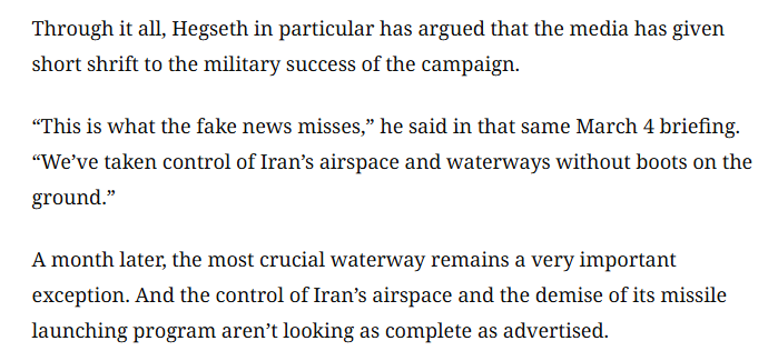 文章最后說(shuō),在赫格塞思說(shuō)出這番話的一個(gè)月后,那條最關(guān)鍵的航道仍是一個(gè)“重大例外”。至于所謂“已完全掌控伊朗領(lǐng)空以及摧毀伊朗導(dǎo)彈發(fā)射能力”的說(shuō)法,現(xiàn)實(shí)情況顯然與當(dāng)初的宣揚(yáng)大相徑庭。