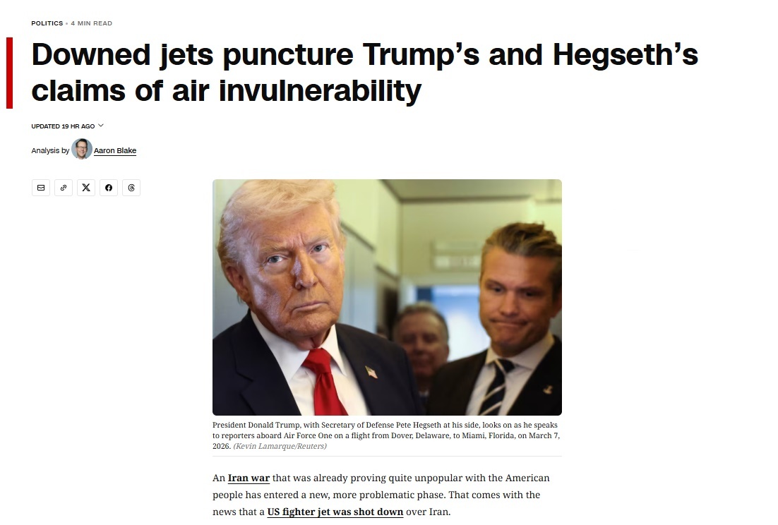 近日,伊朗擊落兩架美軍戰(zhàn)機(jī),美伊“爭(zhēng)分奪秒地比賽”尋找美飛行員的消息吸引了國(guó)際社會(huì)的強(qiáng)烈關(guān)注。美國(guó)有線電視新聞網(wǎng)近日刊文稱,一場(chǎng)本就遭美國(guó)民眾普遍反對(duì)的對(duì)伊戰(zhàn)爭(zhēng),因美軍戰(zhàn)機(jī)在伊朗被擊落而進(jìn)入更棘手的階段。這一事件直接戳穿了美國(guó)政府此前宣稱的空中防御“無(wú)懈可擊”的神話。
