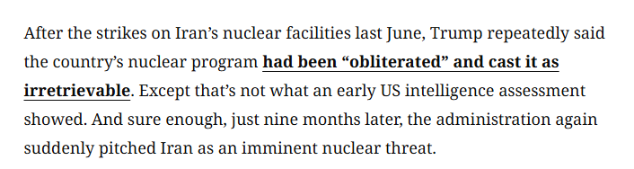 文章認(rèn)為,去年6月美國(guó)轟炸伊朗核設(shè)施后,美國(guó)政府多次宣稱伊朗的核計(jì)劃已被“徹底摧毀”,“已無(wú)法挽回”。然而,美國(guó)當(dāng)時(shí)的一份情報(bào)評(píng)估顯示事實(shí)并非如此。果然,僅僅九個(gè)月后,美國(guó)政府又突然將伊朗描繪成“迫在眉睫的核威脅”。